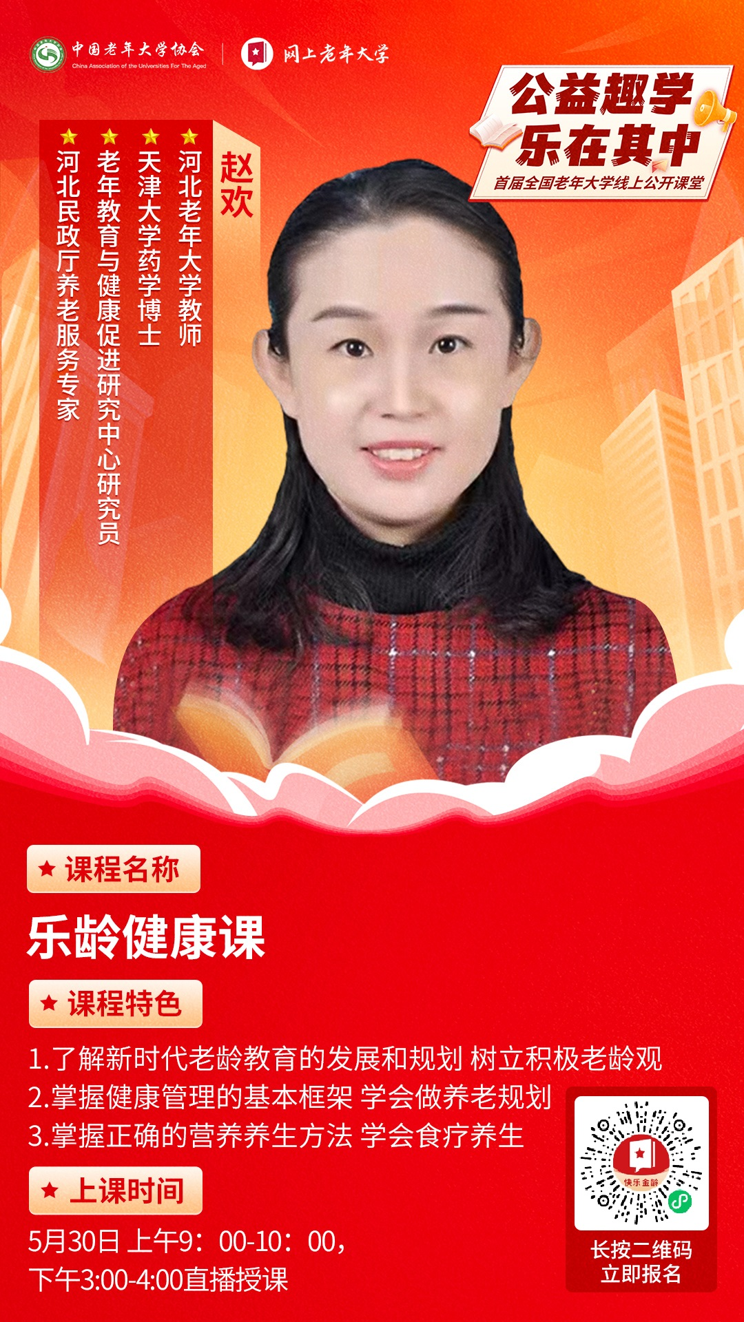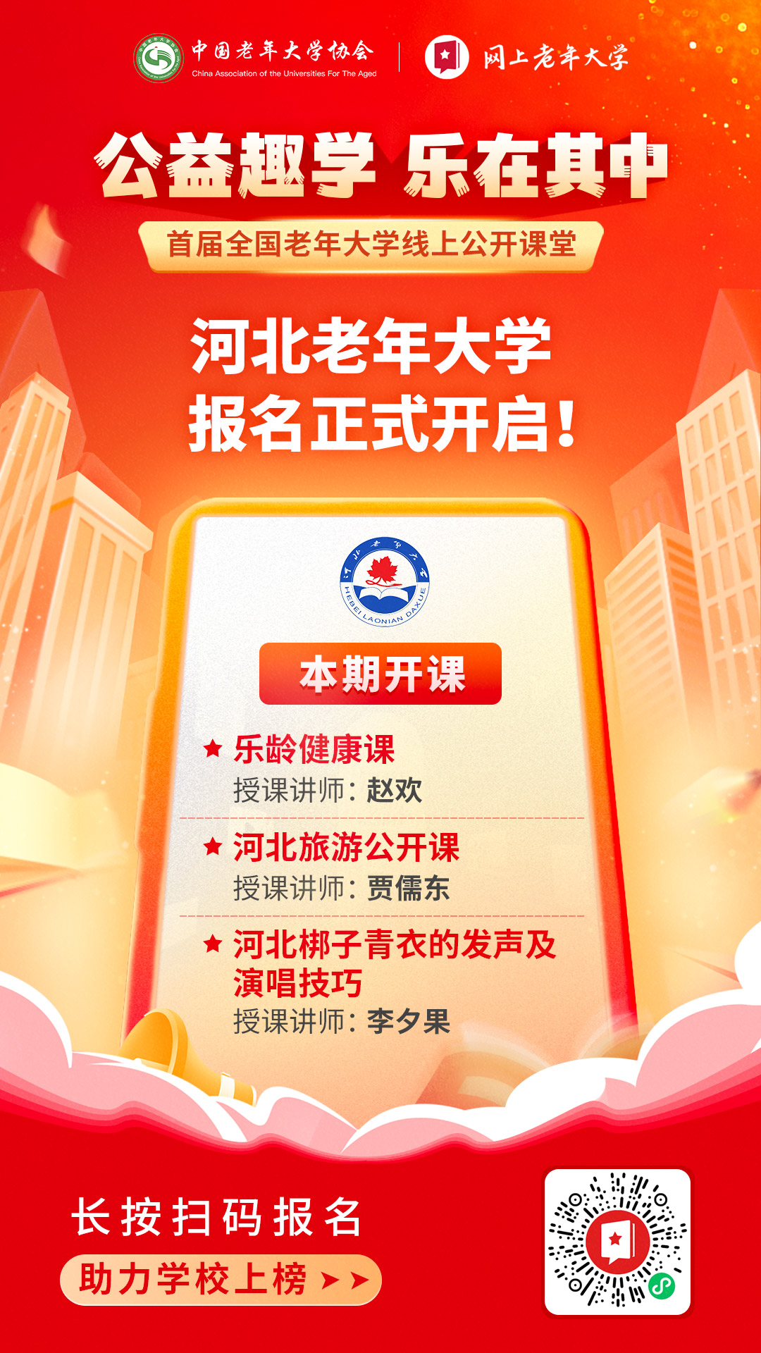 5月25日至30日,我校赵欢老师的乐龄健康课、贾儒东老师的畅游正定古城人文地理课,以及李夕果老师的河北梆子青衣的发声及演唱技巧课程将在“网上老年大学”APP陆续开课。观看课程有两种方式: