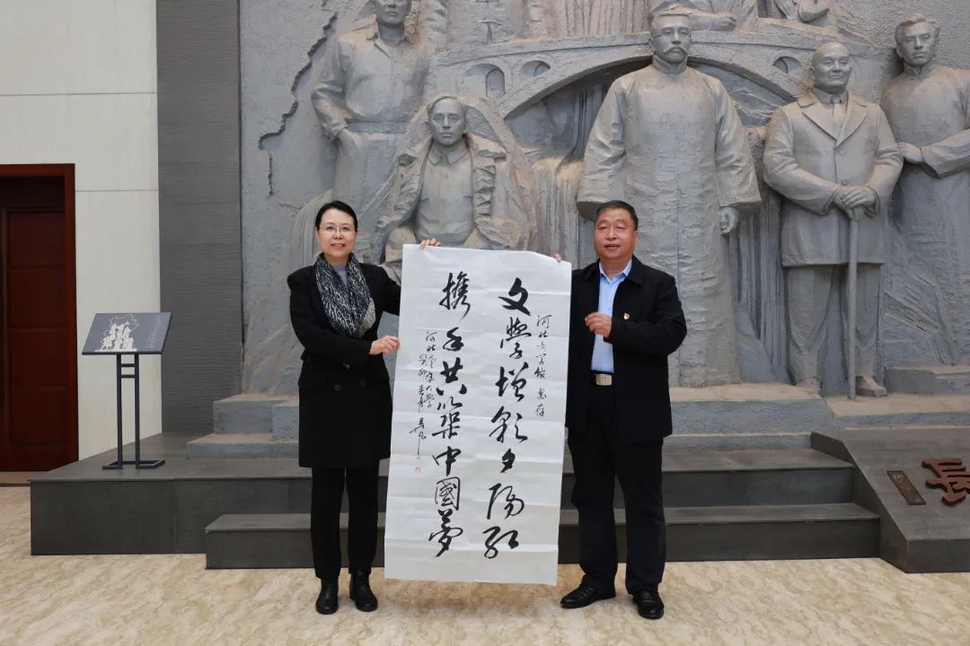 河北省作家协会党组书记、副主席高天,党组成员、副主席刘宝书,河北文学馆馆长刘金星及相关工作人员在文学馆一楼大厅热烈欢迎一行人的到来。高天同志系统介绍了河北文学馆发展历程和基本情况,尚宝英同志也简单介绍了我校发展建设情况。双方互赠书法作品和书籍,借以表达美好的祝福和深刻的纪念。
