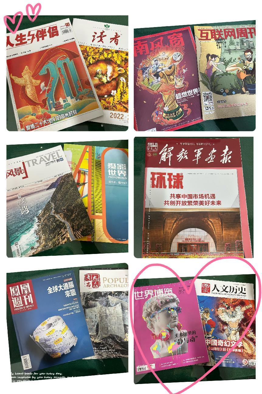 阅读是最好的养生,书籍是精神世界的营养品。在碎片化阅读盛行的时代,您有多久没有静下心来好好读完一本书了呢?此次全民读书月第一个环节“期刊赠阅活动”,将带您重新体会纸质书籍的魅力,期刊内容品类丰富,有社科、时事政治、文学、军事、摄影、老人世界期刊等,全部免费赠阅,以下为部分期刊展示:
