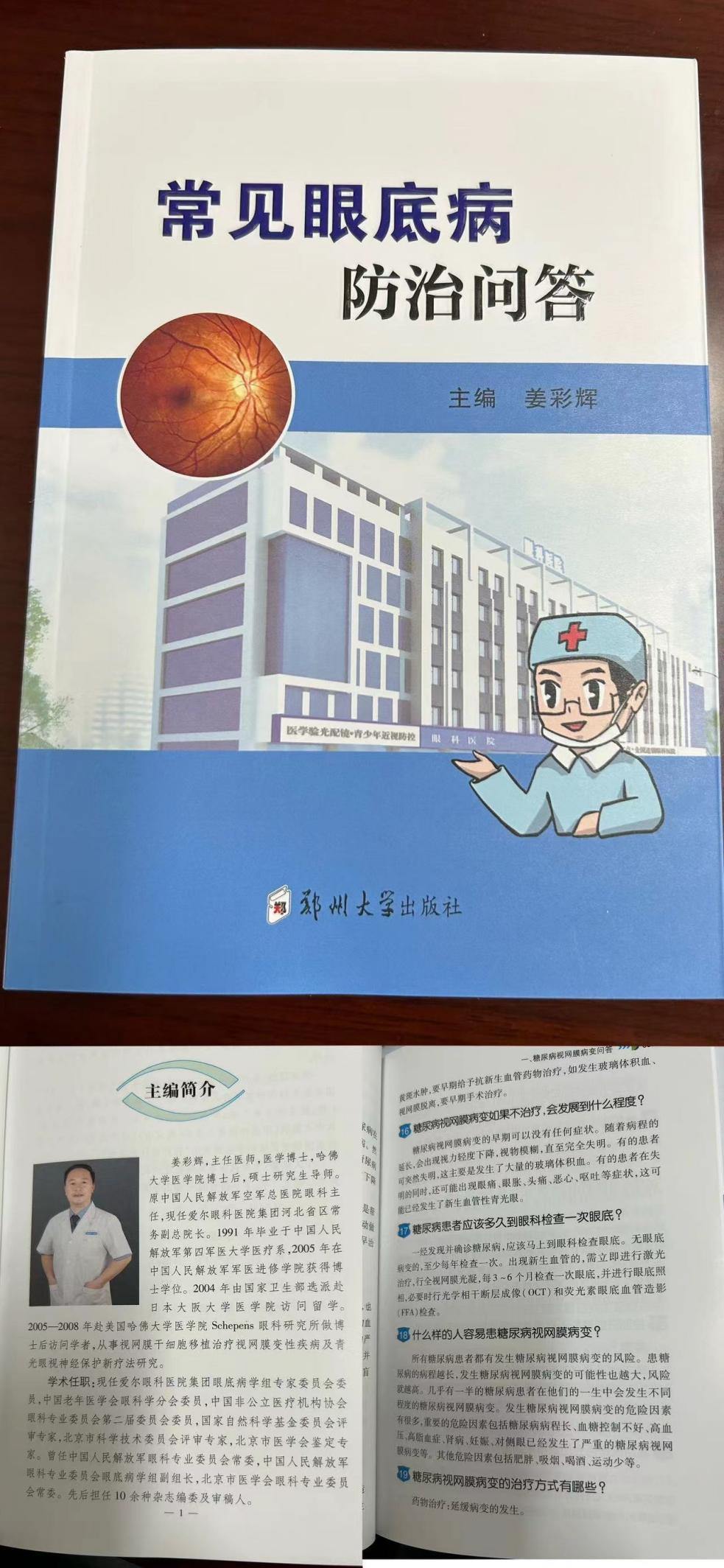 《常见眼底病防治问答》由郑州大学出版社出版,爱尔眼科医院集团河北省区常务副总院长,医学博士,哈佛大学医学院博士后姜彩辉主编。