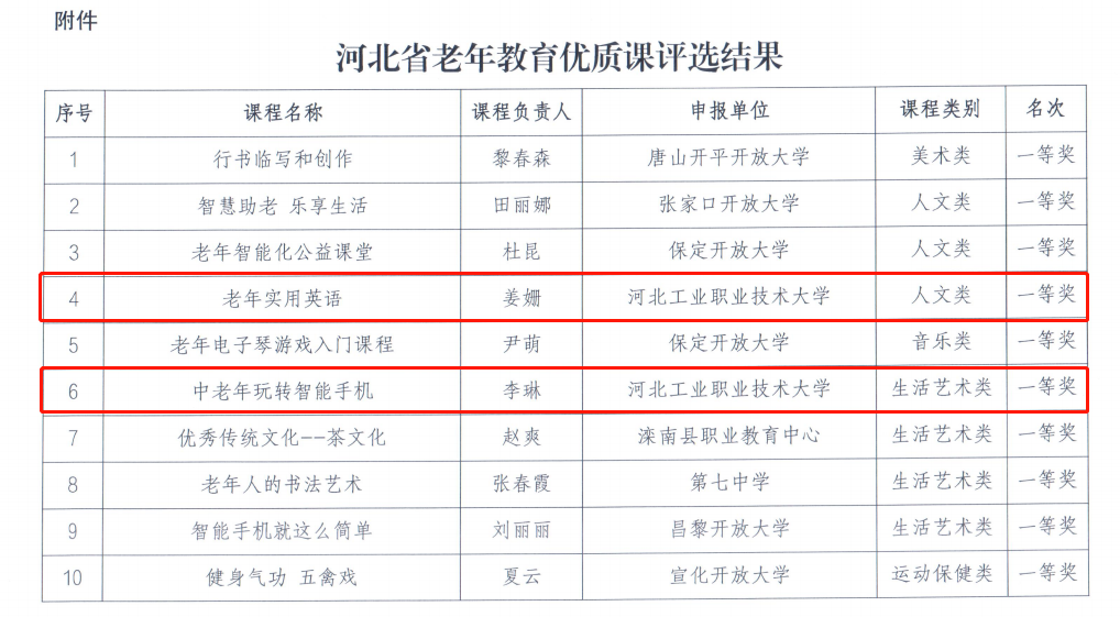 近日,由河北省教育厅组织的2023年河北省老年教育优质课评选结果公示,我校选送的《老年实用英语》《玩转智能手机》课程荣获2023年度河北省老年教育优质课一等奖,《软笔书法》《声乐》课程荣获2023年度河北省老年教育优质课二等奖。
