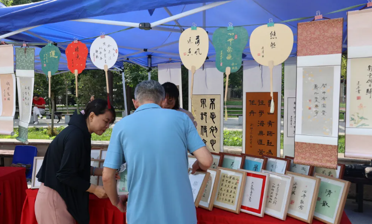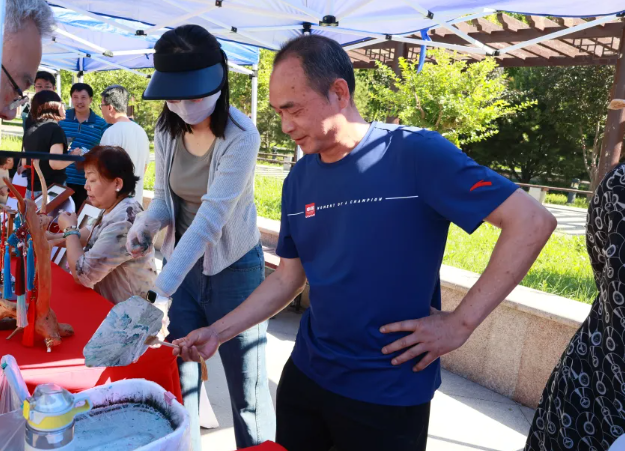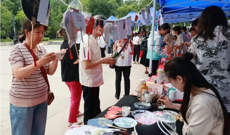 体验非遗漆扇,品尝咖啡西点,把玩手工文创。精美又饱含吉祥寓意的编绳、喜庆且富有民俗意味的剪纸、遒劲而古朴高雅的篆刻、生动传神的翰墨丹青,让人看得心潮澎湃、眼花缭乱。买到不少“货”的刘奶奶开心地和我们说:“今天来的真值,没想到有这么多精美的手工艺品。端午节就要到了,我孙子马上就要参加中考,给他买了些“一举高粽”含义的扇子、挂饰,祝福他能够取得好成绩。”