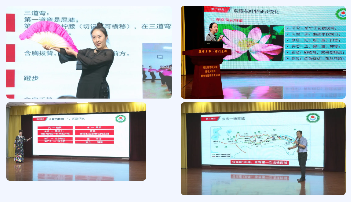 7月31日上午9点,教学大比武展示暨业务培训交流活动正式开始,各教师都精心准备了不同学科类型、不同地域文化特色的课程内容,如怀来县老年大学思政教师李兆嵩,讲授了银龄生活的境界与品位一课,旨在助力老年学员树立积极老龄观、健康老龄化理念,觉悟人生,奉献社会,科学定位自身,提高人生境界与生活品位;唐山市老年大学杨婉秋老师讲授了合唱演唱技巧—弱声唱法,分析了合唱作品中“弱唱”的表达方式,帮助学员了解合唱中弱唱的作用和意义。杨老师运用国外先进的柯达伊音乐教学法,带领学员深入体验音乐的魅力,用不同曲目讲解四种弱唱方法,训练合唱团员对声音的控制能力,做到弱而不虚,使合唱团成员的演唱技巧和音乐表达能力得到提升;秦皇岛市老年大学马晓坤老师讲授了《茉莉花》钢琴演奏教学,马老师从《茉莉花》曲目创作背景、渊源及此曲在中国音乐文化中的重要地位,带领学员感受乐曲活泼、欢快的风格。最后通过空灵鼓演奏《茉莉花》,使学员体验相同曲目不同韵味的中国传统音乐文化,感受曲目蕴含的美感和情感,激发学员对民族音乐的热爱,提升艺术审美和艺术修养;廊坊市老年大学张玉忠老师讲授了《奔驰在千里草原》二胡演奏教学,张老师讲述了该曲的创作背景,带领大家感受草原牧民生活情景,重点讲授了揉弦、抛弓的正确演奏方法和演奏技巧,不同段落的演奏情绪、气口、强弱变化,带领学员感受牧民的喜悦之情和对美好生活的向往;HTH.COM-华体会(中国)舞蹈老师滕妲讲授了河北三大民间舞蹈之沧州落子《放风筝》,滕老师从沧州落子的发源,结合河北民间舞的身韵特色,呈现出一幅极具民族传统文化的优美画卷,这既是对中华民族绚烂文化的传承,也是对河北本土优秀剧目的拓延发扬,为大家带来一堂别开生面的精品示范课;衡水市老年大学马云霞老师讲授了《国画—荷花》,马老师以荷花的画法为教学重点,通过观察荷花图片,了解荷花和荷叶的结构特征,利用图例讲解、亲手示范等方法分步骤讲解荷花的花冠、花蕾、荷叶、叶柄等画法,介绍双勾填色法、没骨法、没骨勾纹法等特殊技法,使学员掌握绘制荷花、荷叶、花蕾的技巧;邢台市老年大学笑虹老师讲授了《朗诵艺术—普通话的语流音变,轻声和儿化》,笑虹老师从“为什么要学习朗诵艺术”为出发点,讲解了朗诵的概念及要求、普通话语流音变的现象及在朗诵中的作用、轻声、儿化在朗诵教学中的应用等,并通过简单的朗诵训练,带领学员共同感受朗诵的魅力;张家口市老年大学刘艳朝老师讲授的《历史文化品鉴—光武复汉》,从中国古代东汉时期光武帝开创东汉及历史意义,到大汉与西域中的丝绸之路之陆上丝绸之路,进一步讲解以河北张家口为起点的一条雄奇古老又内蕴的草原丝绸之路,既从历史的角度深刻解读了张家口市地域文化源流,又从当代旅游文化视角对张家口区域特色文化作简要介绍,给老年学员呈现了一堂古今交融独具感染力的历史文化品鉴示范课程;石家庄市老年大学吴英老师讲授了《自在正定—正定古建筑文化之旅》,吴老师通过对正定古城基本概况介绍和正定古建筑赏析,让学员对正定古城有初步认知。了解正定古城代表建筑的特色,重点讲授正定古城墙、隆兴寺以及正定四塔,理解中国古建筑蕴含的精神文化,树立文化自信;围场县老年大学孙孝忠老师讲授了《颈肩部保健按摩》,孙老师通过讲授理论知识和操作技能训练,让学员了解颈肩部保健按摩的作用;掌握颈肩部保健按摩的穴位、手法、步骤等,熟练运用所学按摩手法降低颈椎病和脑血管疾病发病几率,达到强身健体的作用;HTH.COM-华体会(中国)周海宁老师讲授了《八段锦—第二式 左右开弓似射雕》,周老师详细介绍了八段锦第二式“左右开弓似射雕”的基本原理,讲解了上焦、中焦脏腑和心肺、肝胆以及相应经脉的养生功效。实践练习左右开弓似射雕基本动作及八段锦的呼吸与拳架动作;承德市老年大学丁文义老师讲授了《手机摄影—手机拍出虚实效果的唯美照片》,丁老师介绍了如何利用手机拍出虚实效果的唯美照片。以景深理论为先导,引出影响景深的三种因素,介绍手机中实现虚化效果的常用模式,讲解如何正确选用手机拍摄模式,拍出虚化效果的照片,并带领学员在室内分组进行手机模式虚化操作练习。此次教学大比武,12位教师讲授的课程颇具地域文化特色,为我省老年大学教师教学良好发展树立了典范。