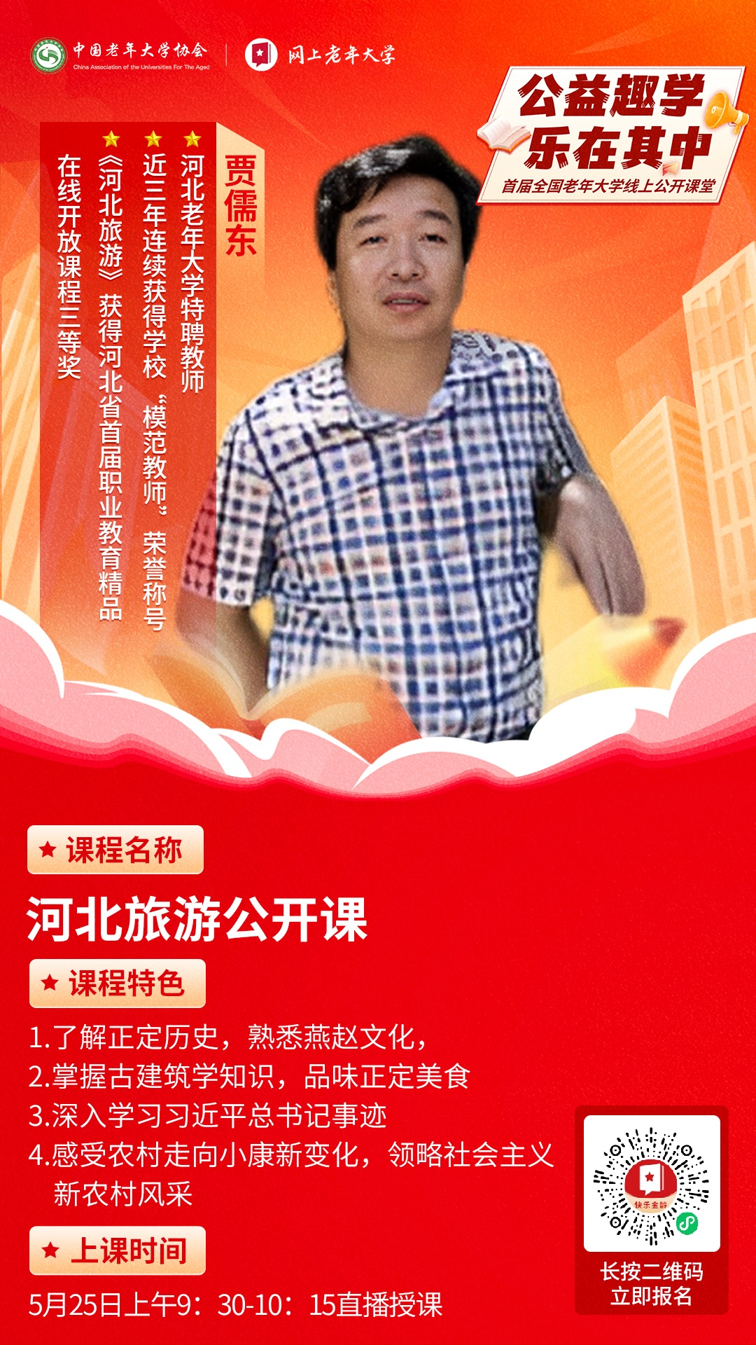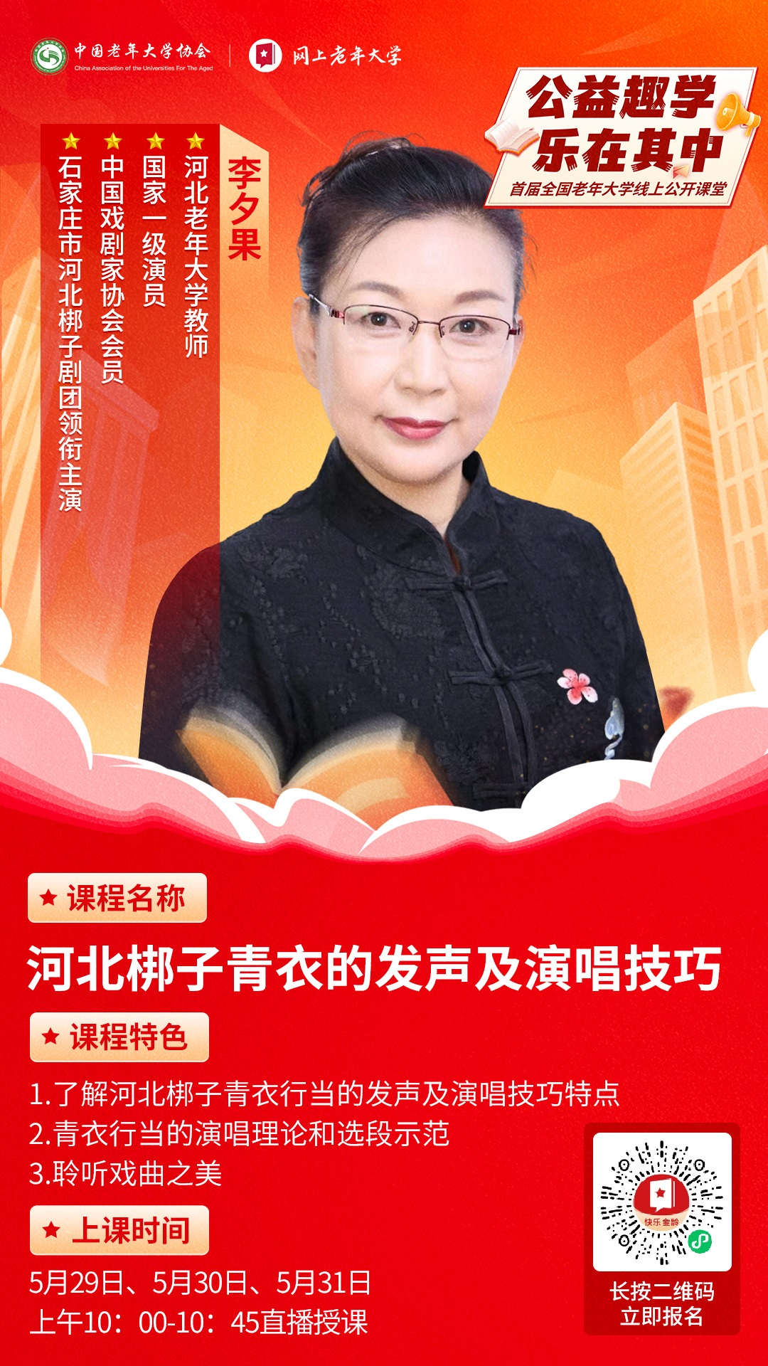 5月25日至30日,我校赵欢老师的乐龄健康课、贾儒东老师的畅游正定古城人文地理课,以及李夕果老师的河北梆子青衣的发声及演唱技巧课程将在“网上老年大学”APP陆续开课。观看课程有两种方式:
