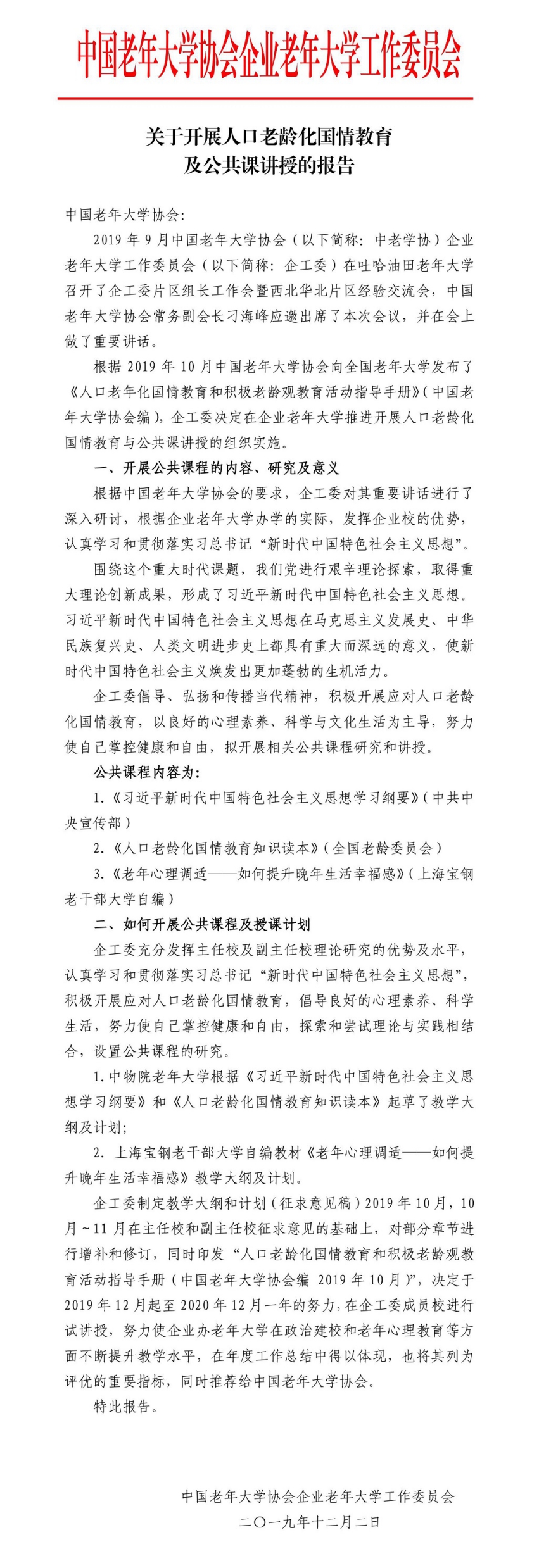 中国老年大学协会企业老年大学工作委员会关于开展人口老龄化国情教育及公共课讲授的报告